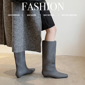 2025新款欧美小众洋气长靴女烟筒靴不过膝个性单靴编织低跟高筒靴