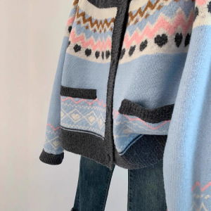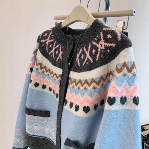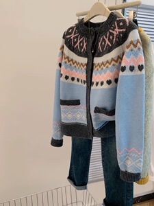 蓝色费尔岛浣熊绒毛衣开衫女秋冬2025新款慵懒短款小个子针织外套