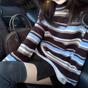 法式复古撞色条纹长袖毛衣女秋季独特超好看设计感宽松针织上衣潮