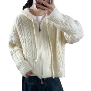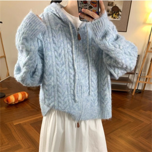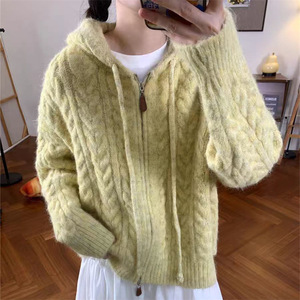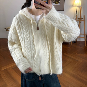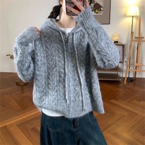 韩系拉链连帽麻花毛衣外套女秋冬新款宽松百搭纯色慵懒风针织开衫