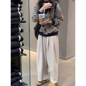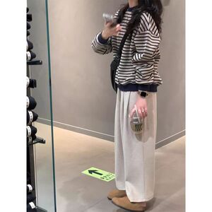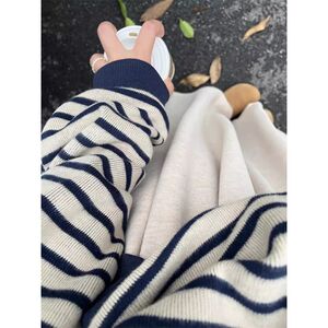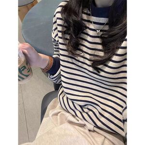 长袖复古条纹圆领卫衣女秋装2025新款宽松设计感大码休闲套头卫衣