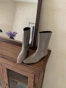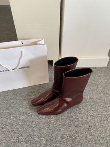 2025秋冬新款低跟靴子小方头短靴法式坡跟漆皮短筒靴纯色直筒靴女