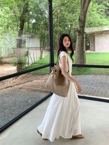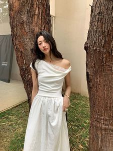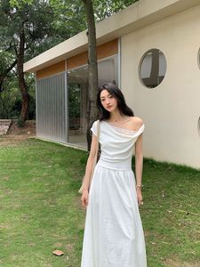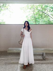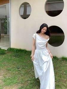 法式白色蕾丝斜肩露肩连衣裙女超好看A字长裙高级纯欲初恋小白裙