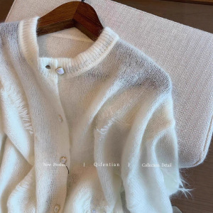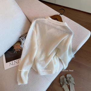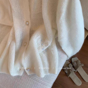 白色钉珠马海毛毛衣外套女秋新款气质慵懒风软糯温柔宽松针织开衫