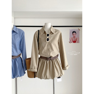 塞纳2025秋季新款韩版显瘦气质百搭通勤高腰花苞条纹衬衫裙女