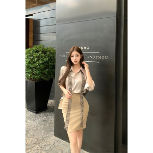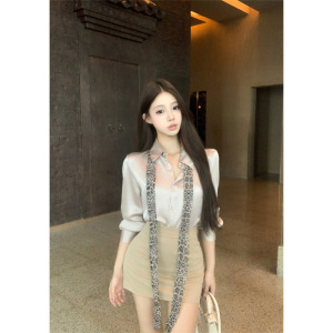 早秋御姐气质光感防晒宽松衬衫配豹纹丝巾+弹力包臀半身裙套装女