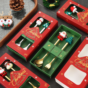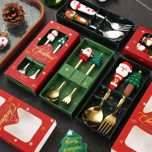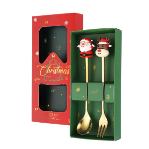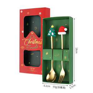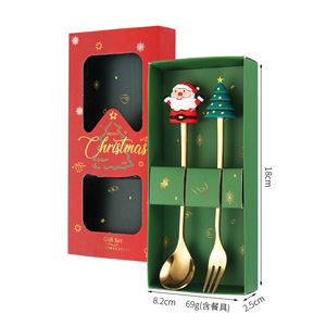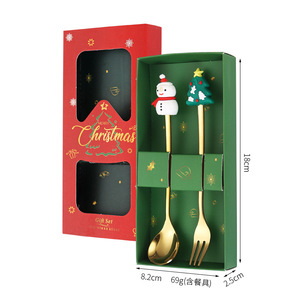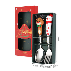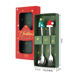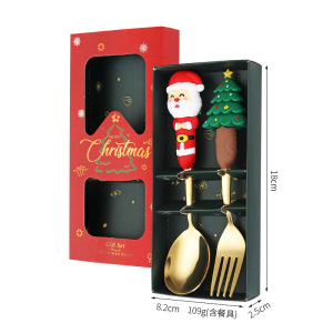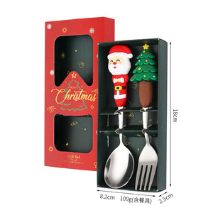 跨境不锈钢餐具趣味圣诞树圣诞老人硅胶叉勺子儿童两件套装礼品