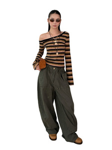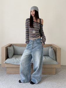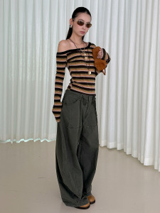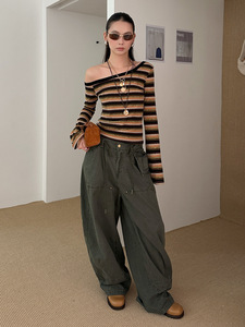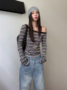 MMFISH时髦街头复古斜肩撞色条纹高弹针织设计感长袖T恤25T473
