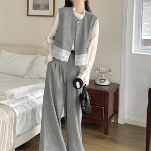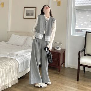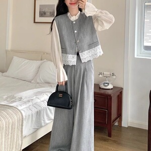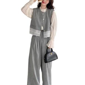 胖MM特大码300斤蕾丝拼接马甲套装女春秋新款高腰阔腿裤两件套ins