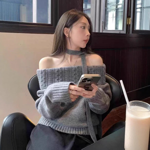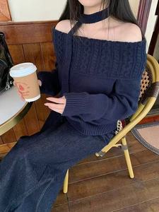 纯色一字肩设计感毛衣女秋冬新款韩系休闲慵懒风修身显瘦针织套头