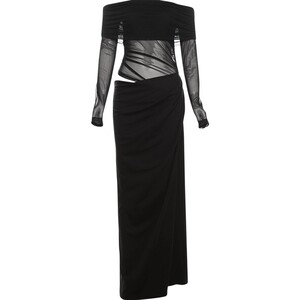 一字肩网纱拼接长袖连衣裙女秋季修身镂空长裙设计感纯欲包臀裙子