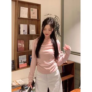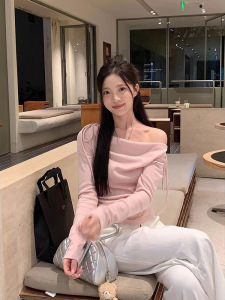 韩系纯欲风一字肩荡领粉色打底衫女秋气质减龄系带蝴蝶结T恤上衣