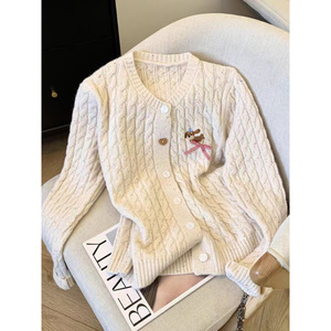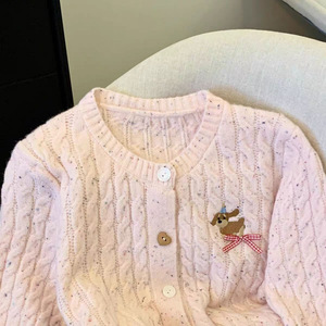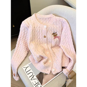 粉色甜美刺绣麻花针织开衫女秋冬高级感彩点软糯毛衣