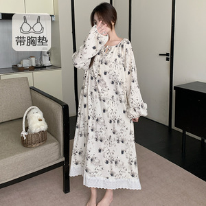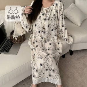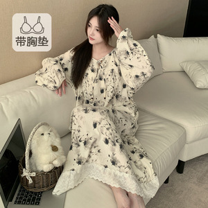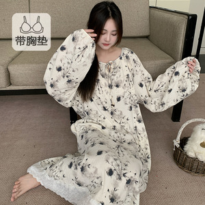 云朵棉睡衣女款春秋季带胸垫复古水墨画长袖睡裙宽松可外穿家居服