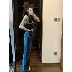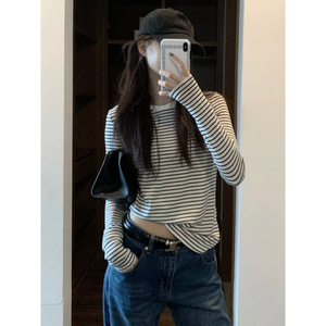小个子白色条纹正肩长袖t恤女早秋季高级感chic别致短款单穿上衣