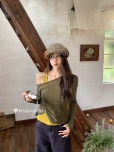 GS.GOOD START-秋季女时髦休闲斜肩网纱小衫+背心两件套装G6299C