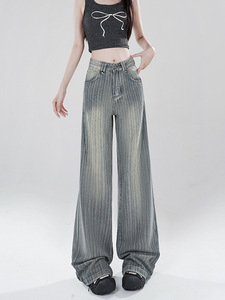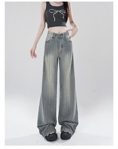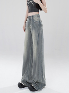 美式复古做旧低腰条纹牛仔裤女春夏百搭显瘦垂感直筒阔腿拖地裤子
