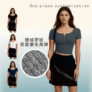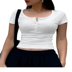 跨境欧美新款女士纯色短袖U领气质上衣罗纹针织半开襟纽扣修身T恤