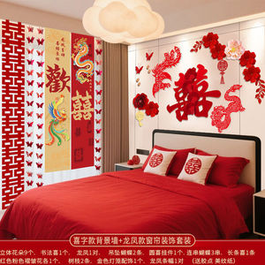 方形金喜背景墙+龙凤款窗帘装饰套装