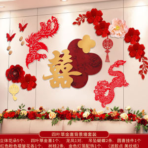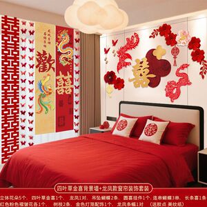 四叶草金喜背景墙+龙凤款窗帘装饰套装