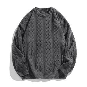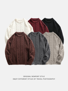 绞花工艺复古圆领毛衣男秋冬新款纯色宽松潮牌麻花线衣针织衫外套