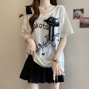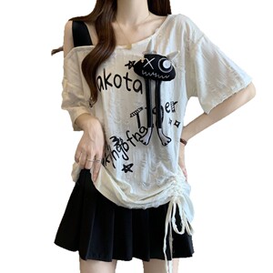大码破洞抽绳褶皱露肩短袖t恤女夏新款胖mm宽松显瘦遮肉斜领上衣