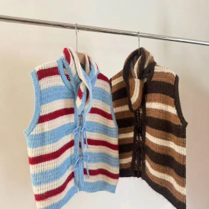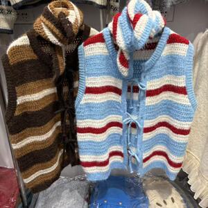 韩系秋冬新款条纹撞色设计感宽松慵懒风叠穿针织马甲带头巾两件套