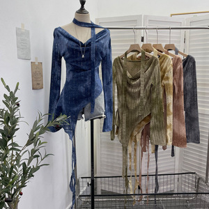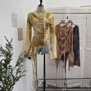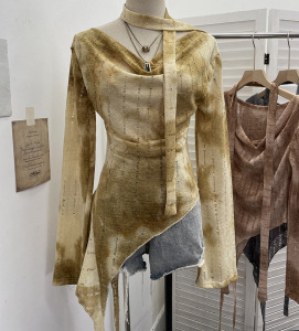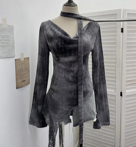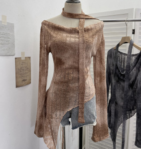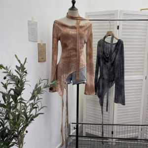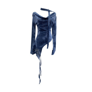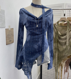 实拍 一字肩荡领长袖破洞针织衫上衣微透镂空不规则飘带T恤女8098