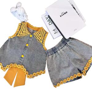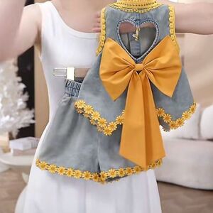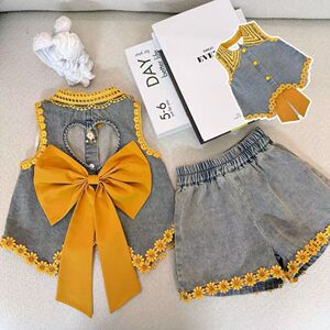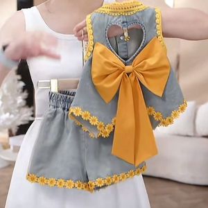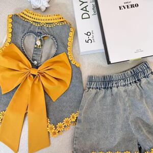 女童夏装牛仔套装夏季2025无袖新款洋气蝴蝶结短裤儿童背心两件套