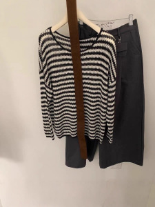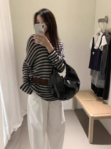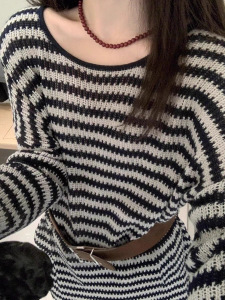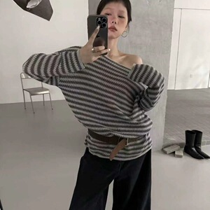 韩系2025早秋新款条纹斜肩长袖宽松针织衫百搭慵懒腰带上衣