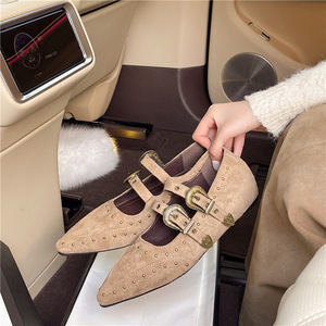 欧美复古尖头平底内增高软皮玛丽珍鞋女棕色铆钉一字带浅口单鞋