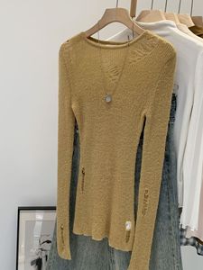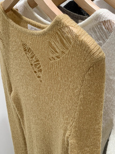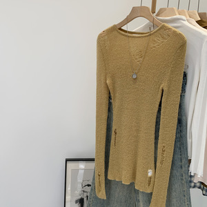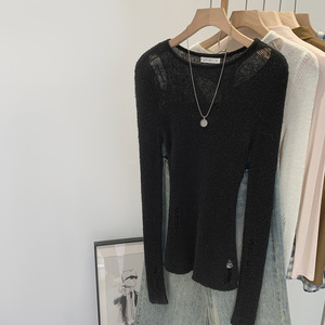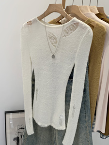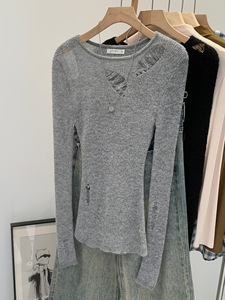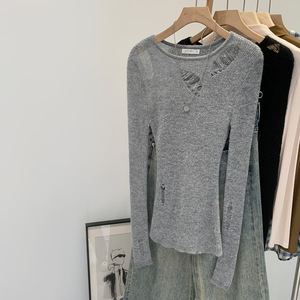 纯欲辣妹镂空羊毛不规则长袖针织衫女2025早秋季新款显瘦慵懒上衣