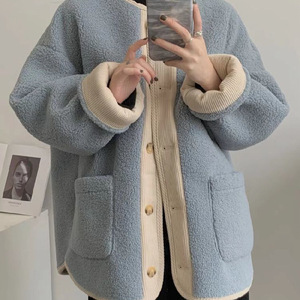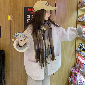 奶系穿搭外套女秋冬新款韩版仿羊羔毛加厚宽松中长款长袖上衣