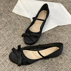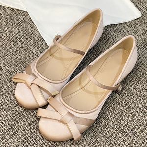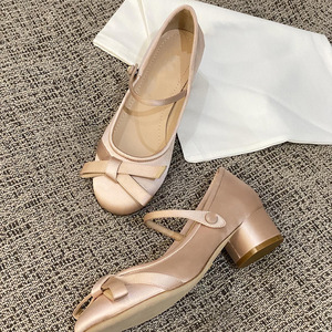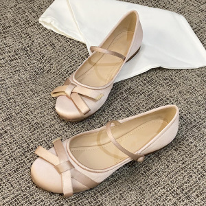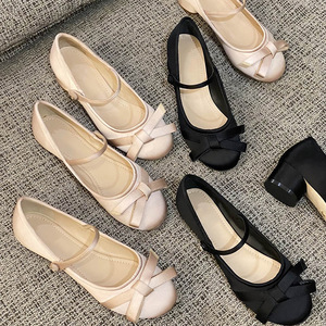 25秋季新款真丝圆头粗中跟蝴蝶结芭蕾舞鞋时尚百搭舒适休闲单鞋女