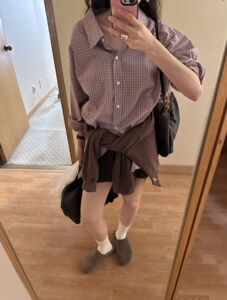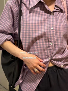 预售2025秋季新款韩国r*ibbonbit棉粉色翻领系扣格纹衬衫