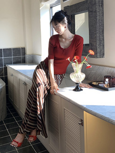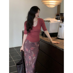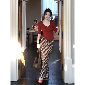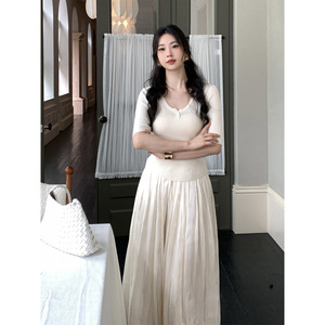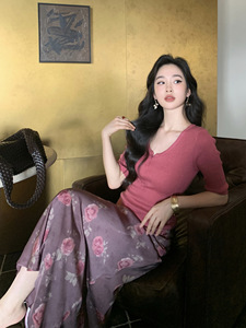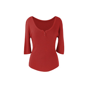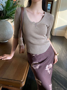 【简弧】SYT自制 通勤显瘦u型领中袖针织衫女秋新款修身弹力上衣