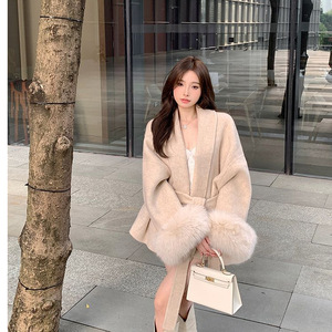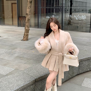 名媛气质杏色v领绑带毛呢外套女秋冬季长袖毛毛宽松中长款大衣