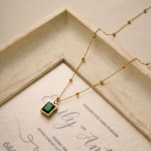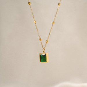 法式新款复古钛钢圆珠祖母绿项链女冷淡风小众设计几何方形锁骨链