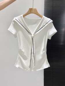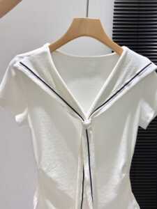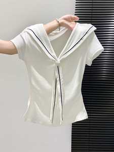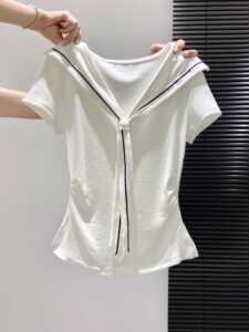 海军领白色正肩短袖t恤女夏季开叉修身掐腰显瘦夏日漂亮小衫上衣