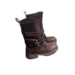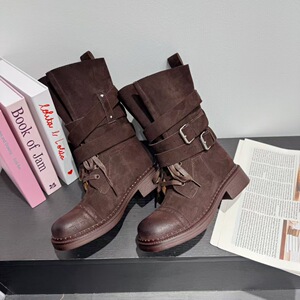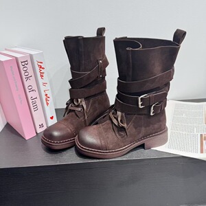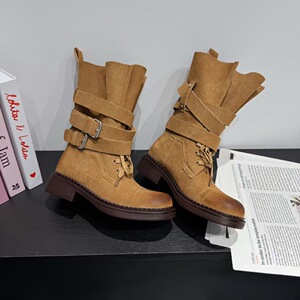 2025新款真皮厚底皮带扣马丁靴百搭休闲中筒靴复古小众机车靴批发