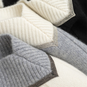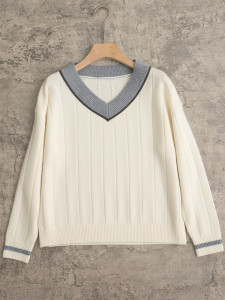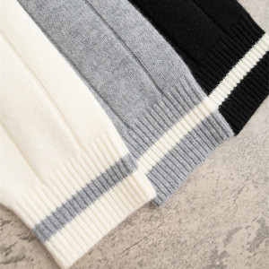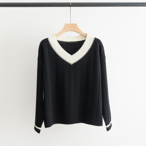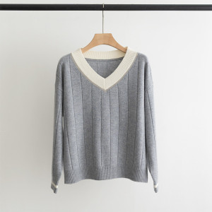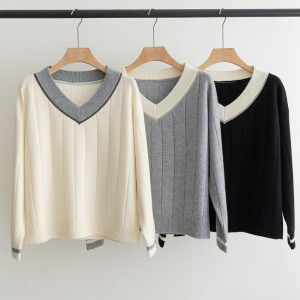 BC镶珠链条撞色V领竖条纹针织衫宽松毛衣女打底衫长袖羊绒羊毛衫