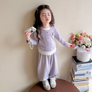 女童2025春秋季套装新款假两件时尚长袖T恤舒适长裤韩版两件套潮