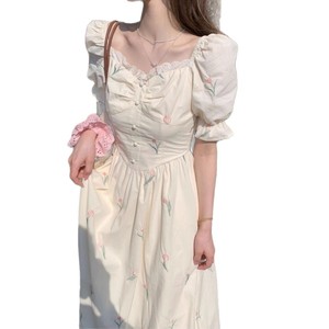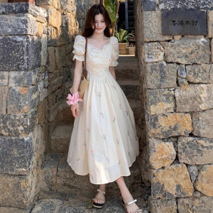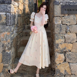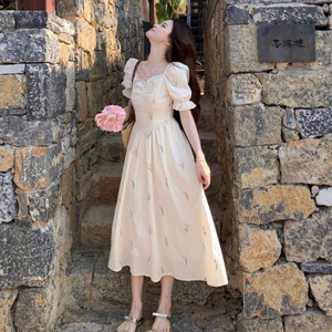 小香风少女装梦境印花夏季泡泡袖法式修身遮肉清新甜美碎花连衣裙