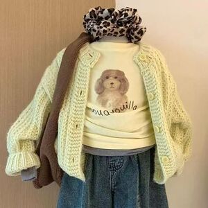 柠檬黄毛衣+小狗T恤+牛仔裤
