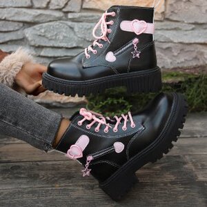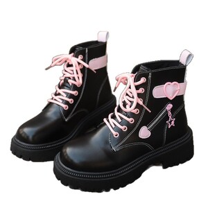 2025春秋新款马丁靴女韩版粉色爱心短筒厚底英伦风系带百搭单鞋潮