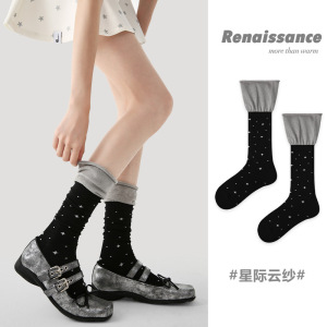 Renaissance秋冬新款中筒袜假两件堆堆袜拼色学院风ins潮袜子女
