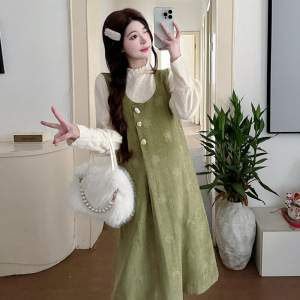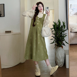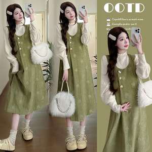 孕妇装秋季新款复古甜美宽松背心连衣裙+蕾丝打底上衣韩版两件套