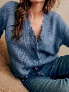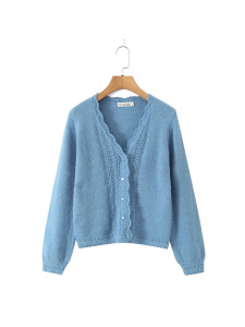 法式甜美温柔复古针织开衫女 25秋新V领软糯泡泡袖钩花毛衣外套女