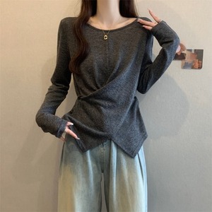 薄款竹节棉正肩长袖T恤女2025春新款大码胖mm卡腰小衫不规则上衣