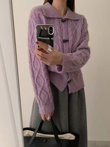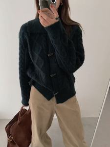 韩系复古翻领牛角扣麻花针织开衫女秋冬新款宽松显瘦软糯毛衣外套